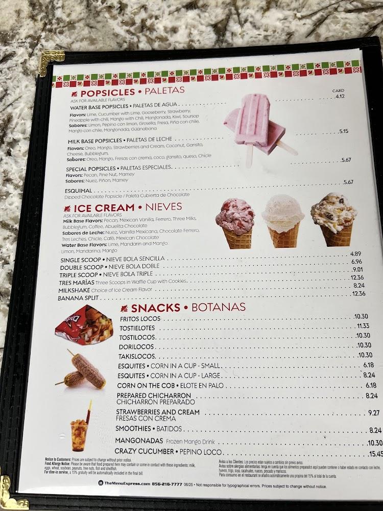 Tacos, sopes, and burritos highlight the lunch and dinner options, inviting sharing among friends. A kid's menu ensures little ones find something they love. For sweet endings, the homemade dessert section features traditional ice cream and popsicles, providing refreshing treats for all ages. With over 32 distinct options, there's something for everyone at La Mexicana.